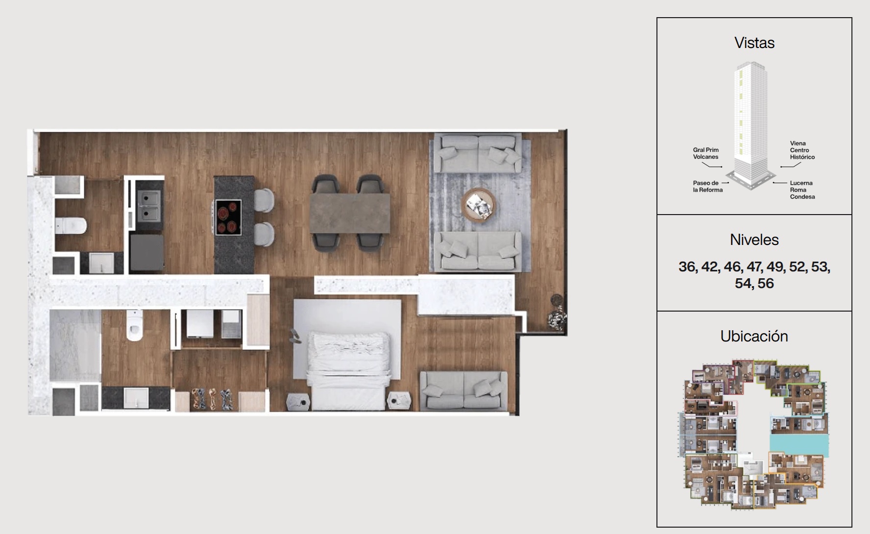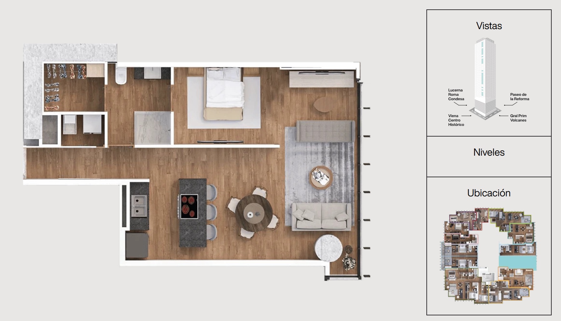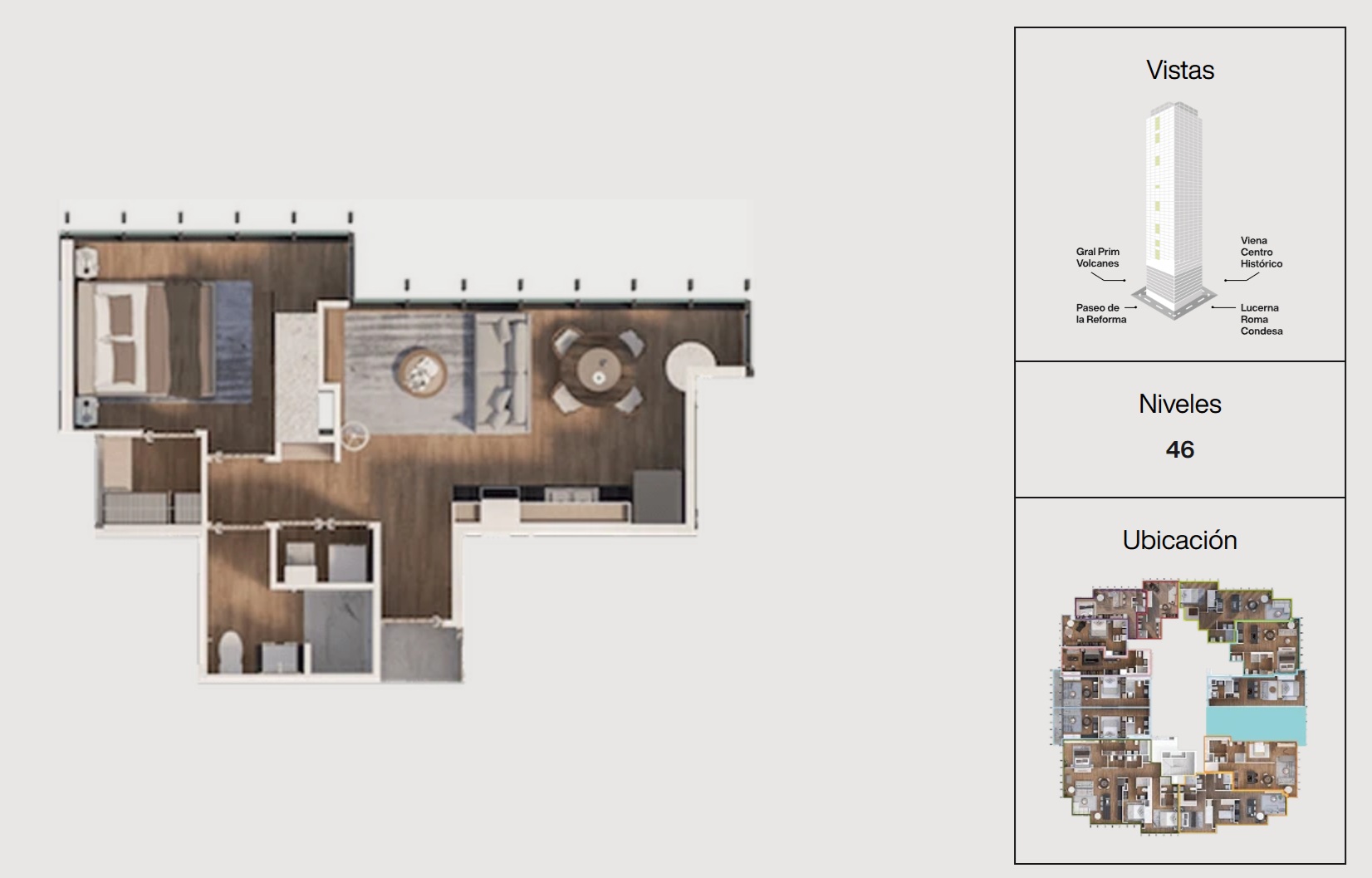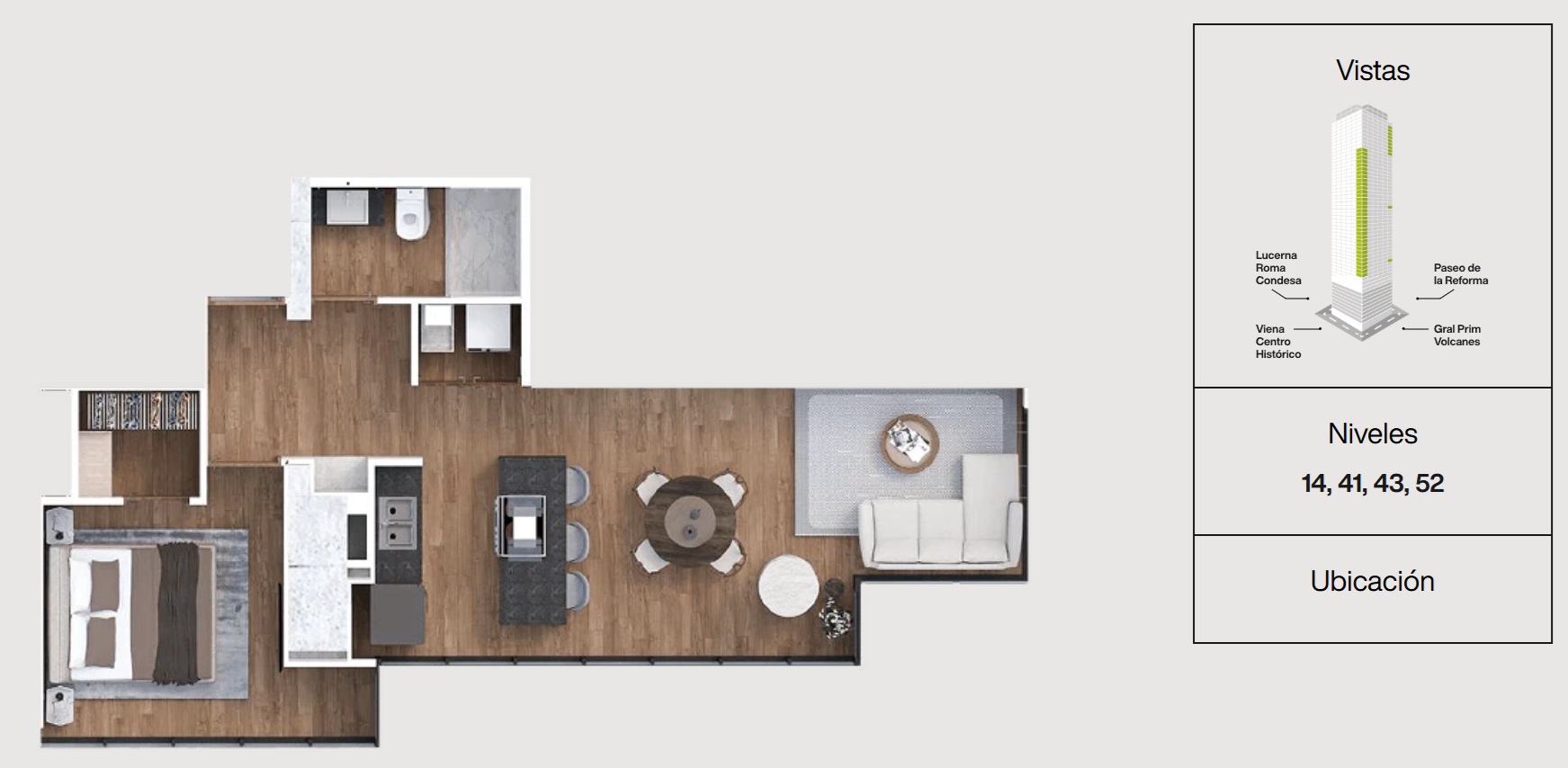 Departamento de 1 recámara en venta en University Tower, la torre residencial de lujo más alta de Paseo de la Reforma, con 58 niveles y 203 metros de altura. Cuenta con una ubicación estratégica, con acceso inmediato a Insurgentes, Zona Rosa, Polanco y el corredor corporativo de Reforma.